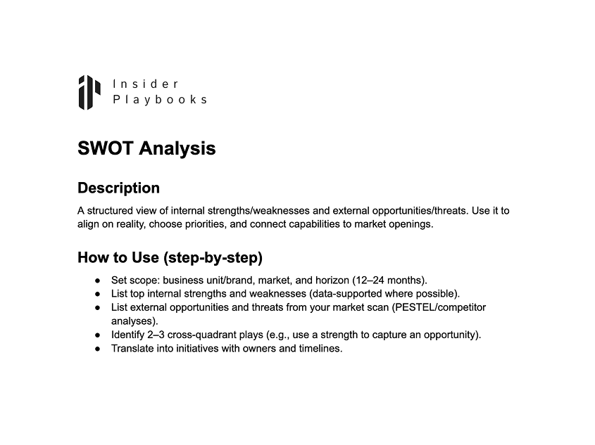 A structured view of internal strengths/weaknesses and external opportunities/threats. Use it to align on reality, choose priorities, and connect capabilities to market openings.