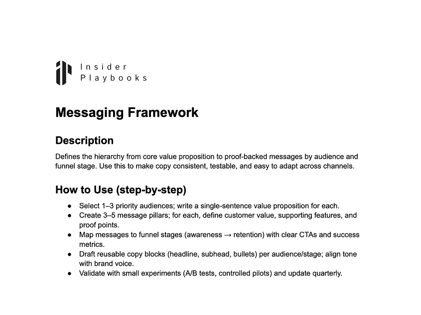 Defines the hierarchy from core value proposition to proof-backed messages by audience and funnel stage. Use this to make copy consistent, testable, and easy to adapt across channels.