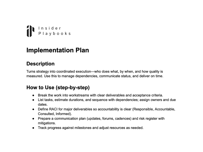 Turns strategy into coordinated execution—who does what, by when, and how quality is measured. Use this to manage dependencies, communicate status, and deliver on time.