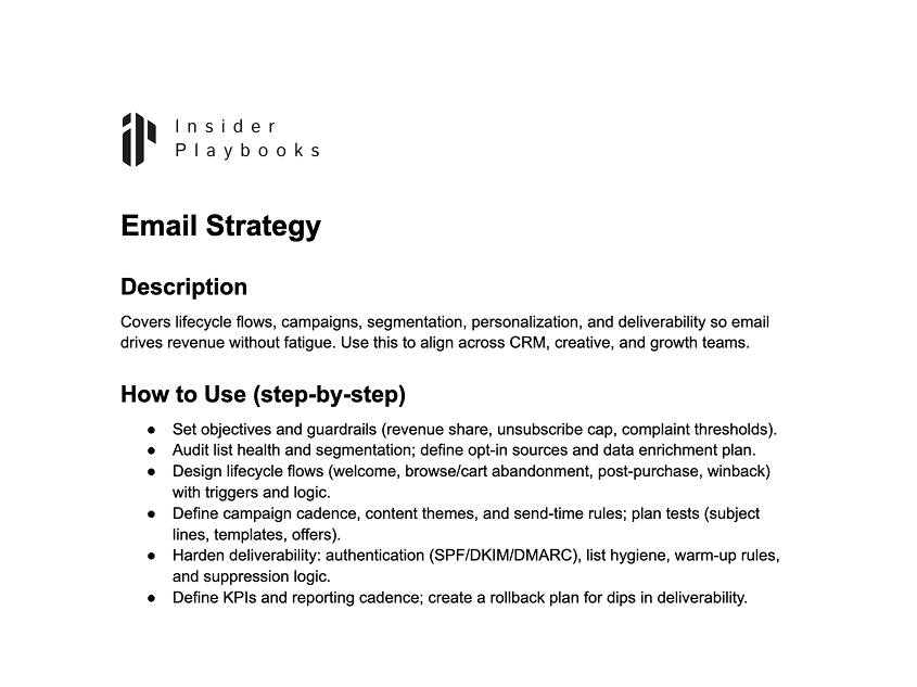 Covers lifecycle flows, campaigns, segmentation, personalization, and deliverability so email drives revenue without fatigue. Use this to align across CRM, creative, and growth teams.