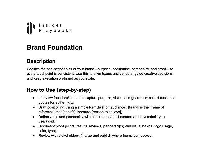 Codifies the non-negotiables of your brand—purpose, positioning, personality, and proof—so every touchpoint is consistent. Use this to align teams and vendors, guide creative decisions, and keep execution on-brand.