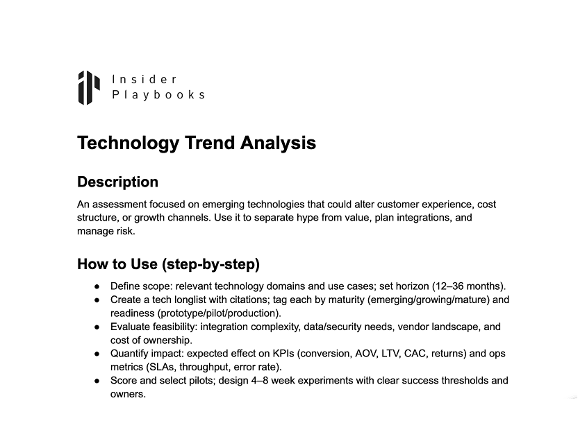 An assessment focused on emerging technologies that could alter customer experience, cost structure, or growth channels. Use it to separate hype from value, plan integrations, and manage risk.