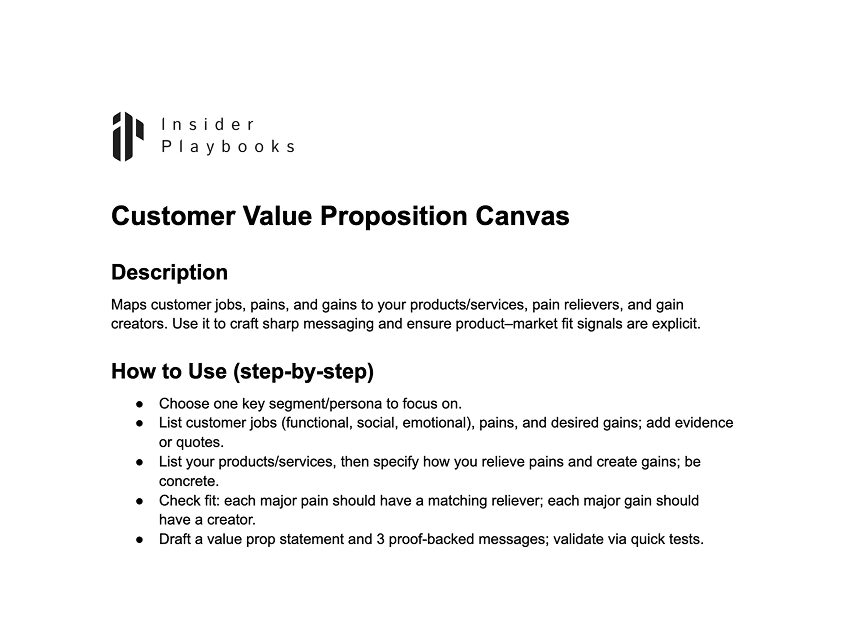 Maps customer jobs, pains, and gains to your products/services, pain relievers, and gain creators. Use it to craft sharp messaging and ensure product–market fit signals are explicit.