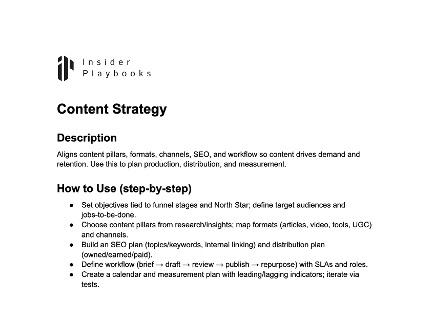 Aligns content pillars, formats, channels, SEO, and workflow so content drives demand and retention. Use this to plan production, distribution, and measurement.