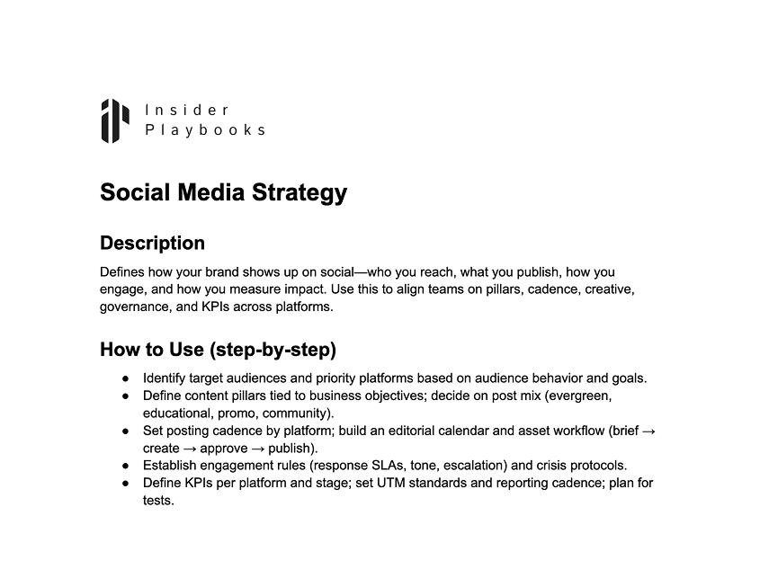 Defines how your brand shows up on social—who you reach, what you publish, how you engage, and how you measure impact. Use this to align teams on pillars, cadence, creative, governance, and KPIs across platforms.