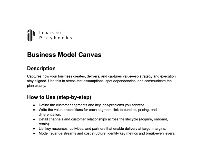 Captures how your business creates, delivers, and captures value—so strategy and execution stay aligned. Use this to stress-test assumptions, spot dependencies, and communicate the plan clearly.