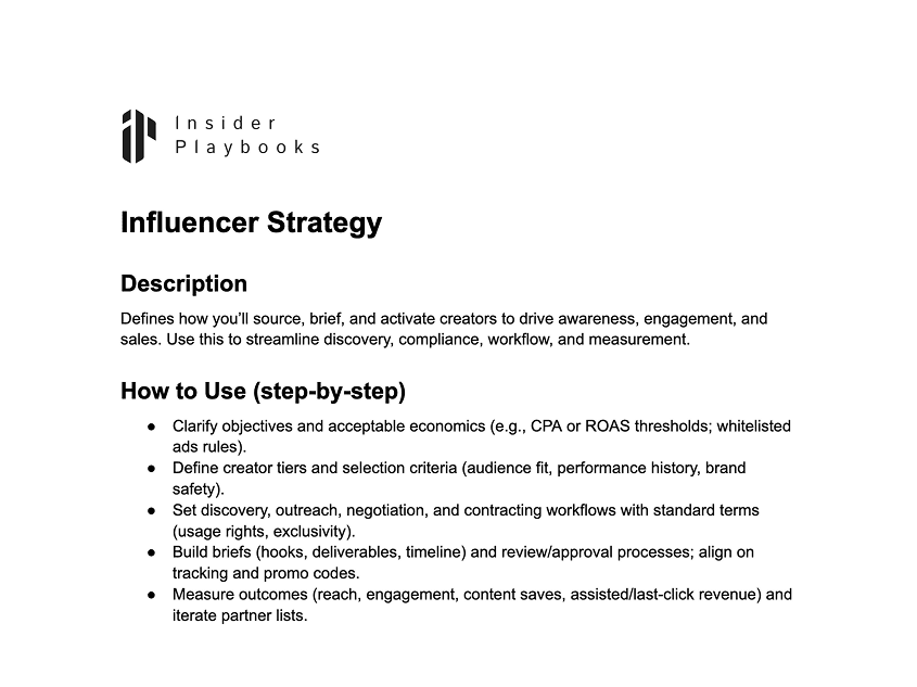 Defines how you’ll source, brief, and activate creators to drive awareness, engagement, and sales. Use this to streamline discovery, compliance, workflow, and measurement.