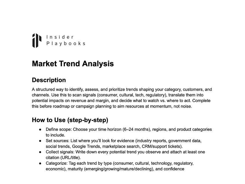 A structured way to identify, assess, and prioritize trends shaping your category, customers, and channels. Use this to scan signals (consumer, cultural, tech, regulatory), translate them into potential impacts on revenue and margin, and decide what to watch vs. where to act. Complete this before roadmap or campaign planning to aim resources at momentum, not noise.