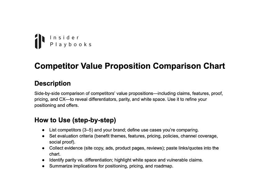 Side-by-side comparison of competitors’ value propositions—including claims, features, proof, pricing, and CX—to reveal differentiators, parity, and white space. Use it to refine your positioning and offers.