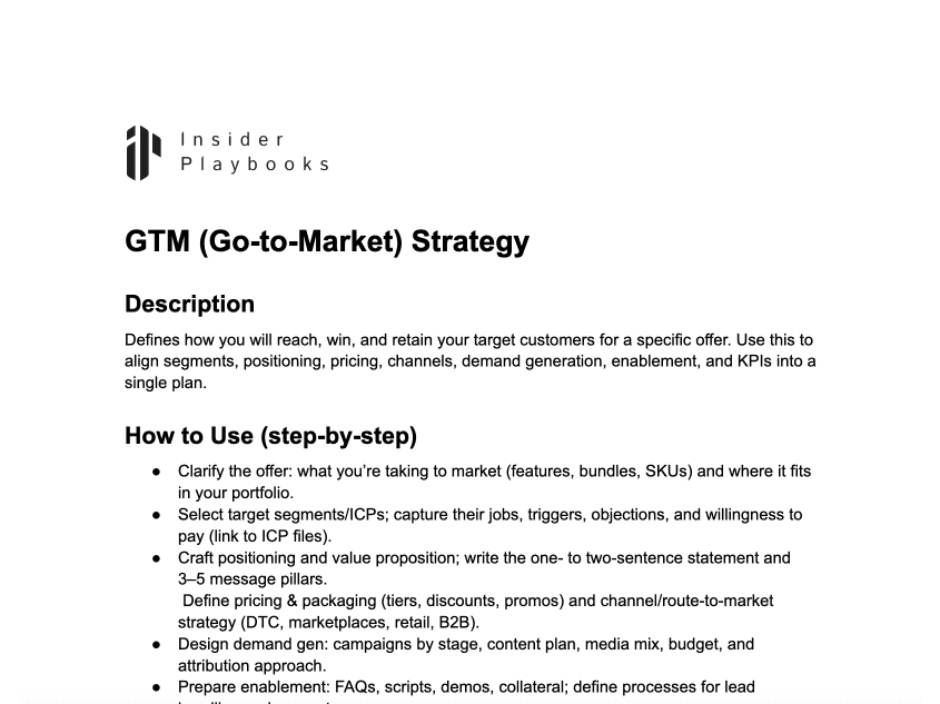 Defines how you will reach, win, and retain your target customers for a specific offer. Use this to align segments, positioning, pricing, channels, demand generation, enablement, and KPIs into a single plan.