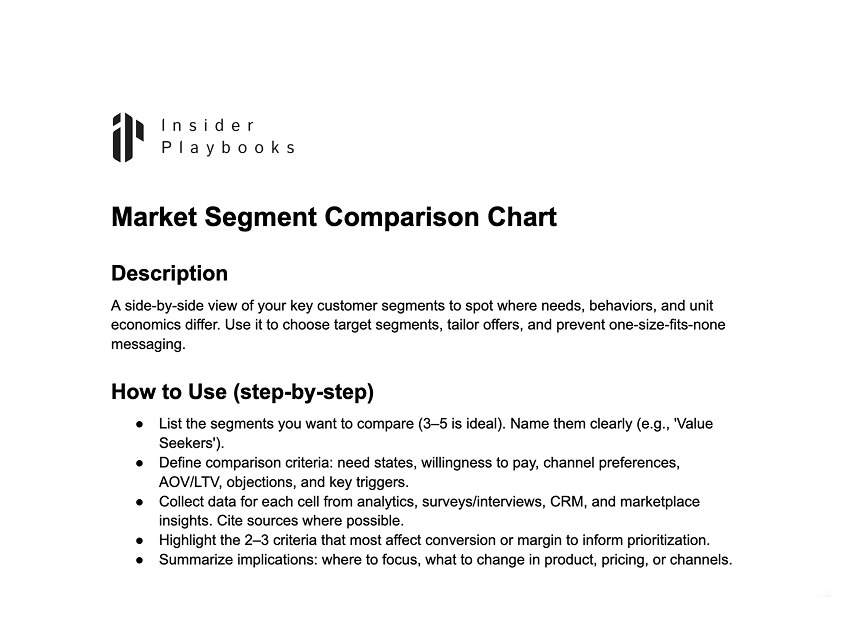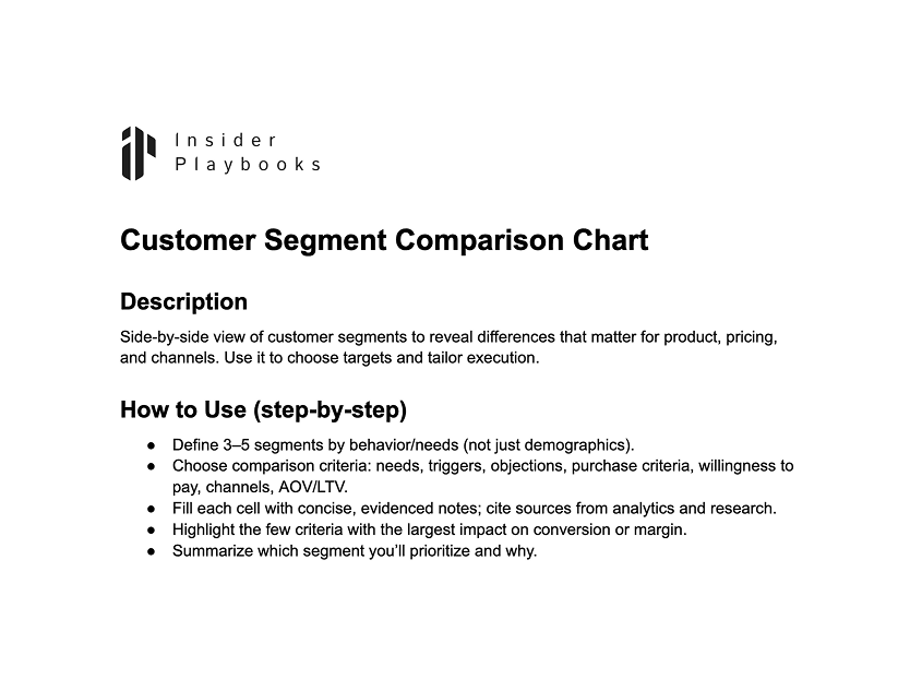A side‑by‑side view of your key customer segments to spot where needs, behaviors, and unit economics differ. Use it to choose target segments, tailor offers, and prevent one‑size‑fits‑none messaging.