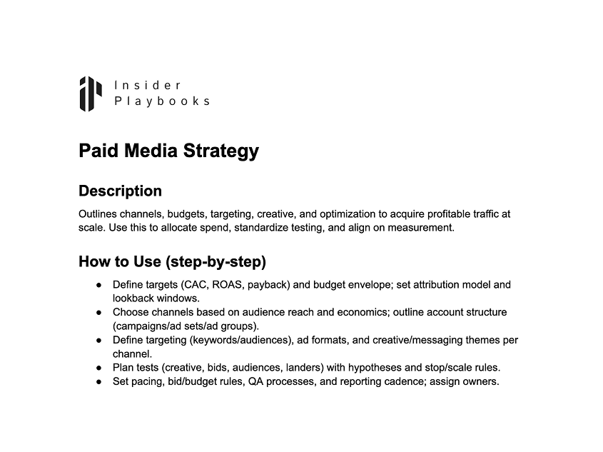 Outlines channels, budgets, targeting, creative, and optimization to acquire profitable traffic at scale. Use this to allocate spend, standardize testing, and align on measurement.