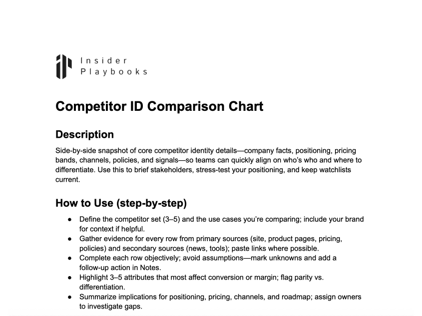 Side-by-side snapshot of core competitor identity details—company facts, positioning, pricing bands, channels, policies, and signals—so teams can quickly align on who’s who and where to differentiate. Use this to brief stakeholders, stress-test your positioning, and keep watchlists current.