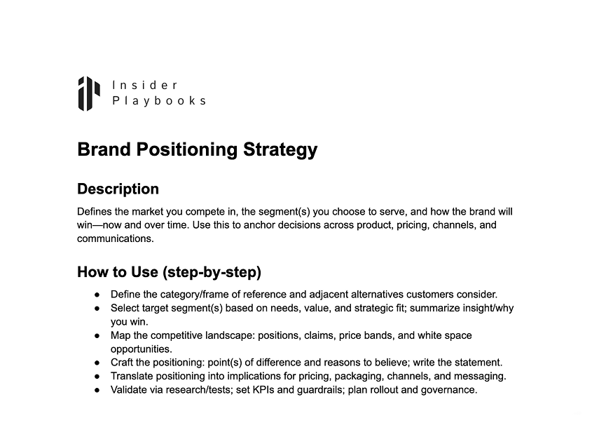 Defines the market you compete in, the segment(s) you choose to serve, and how the brand will win—now and over time. Use this to anchor decisions across product, pricing, channels, and communications.