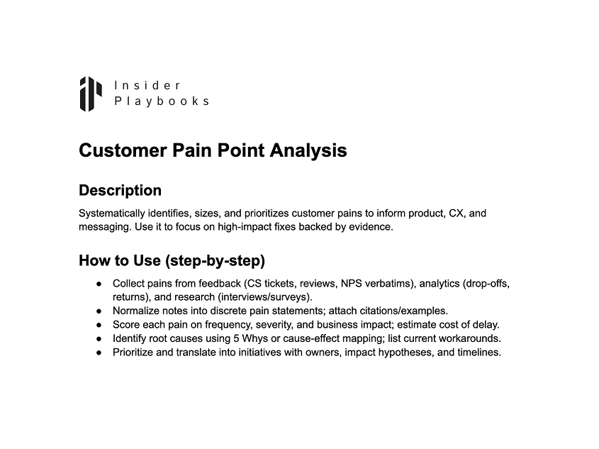 Systematically identifies, sizes, and prioritizes customer pains to inform product, CX, and messaging. Use it to focus on high-impact fixes backed by evidence.