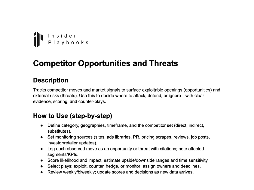 Tracks competitor moves and market signals to surface exploitable openings (opportunities) and external risks (threats). Use this to decide where to attack, defend, or ignore—with clear evidence, scoring, and counter-plays.