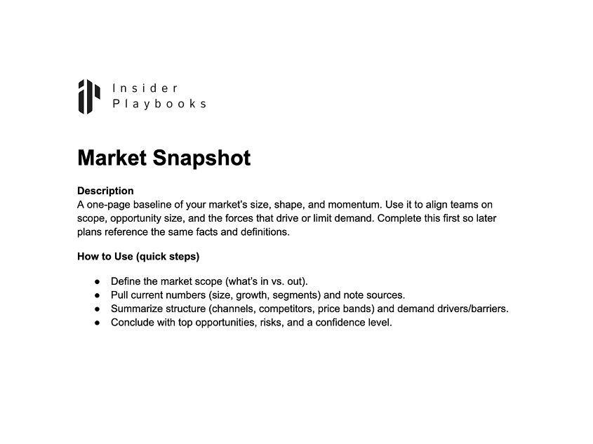 A one-page baseline of your market’s size, shape, and momentum. Use it to align teams on scope, opportunity size, and the forces that drive or limit demand. Complete this first so later plans reference the same facts and definitions.