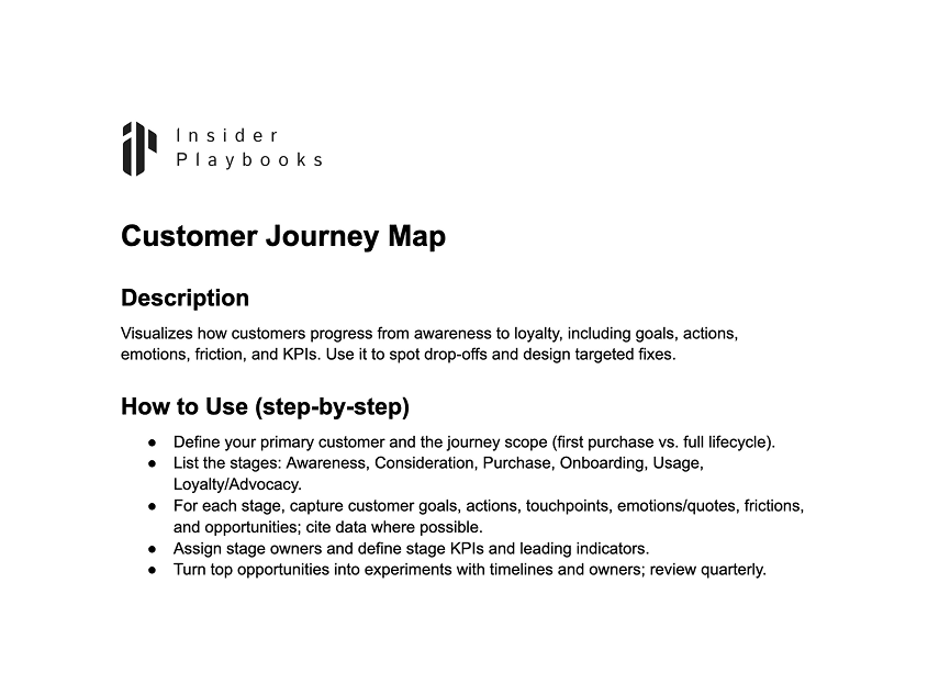 Visualizes how customers progress from awareness to loyalty, including goals, actions, emotions, friction, and KPIs. Use it to spot drop-offs and design targeted fixes.