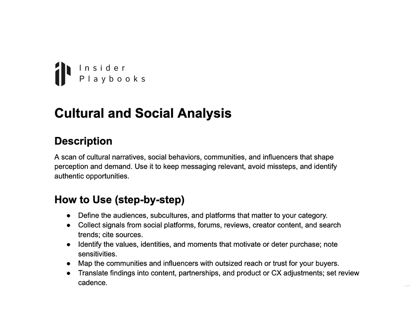A scan of cultural narratives, social behaviors, communities, and influencers that shape perception and demand. Use it to keep messaging relevant, avoid missteps, and identify authentic opportunities.