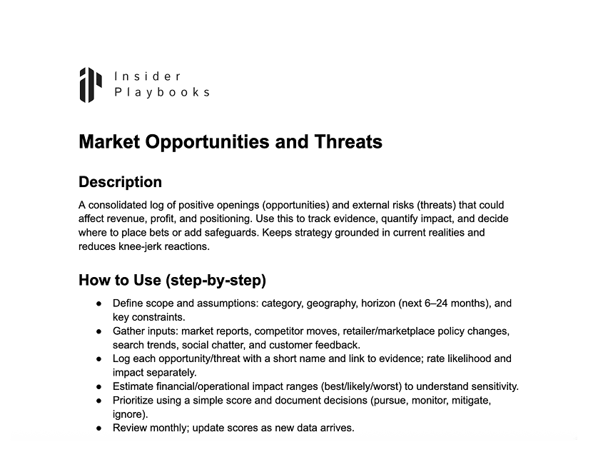 A consolidated log of positive openings (opportunities) and external risks (threats) that could affect revenue, profit, and positioning. Use this to track evidence, quantify impact, and decide where to place bets or add safeguards. Keeps strategy grounded in current realities and reduces knee‑jerk reactions.