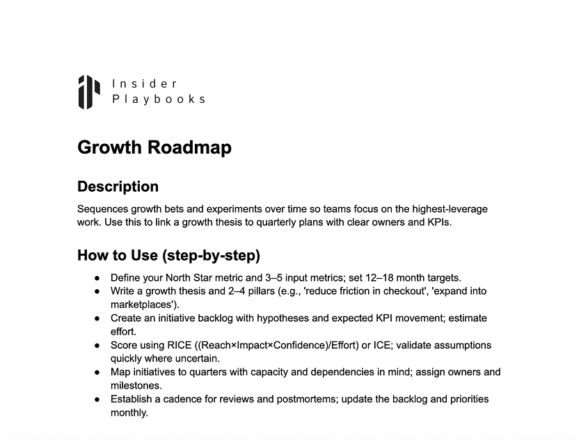 Sequences growth bets and experiments over time so teams focus on the highest-leverage work. Use this to link a growth thesis to quarterly plans with clear owners and KPIs.